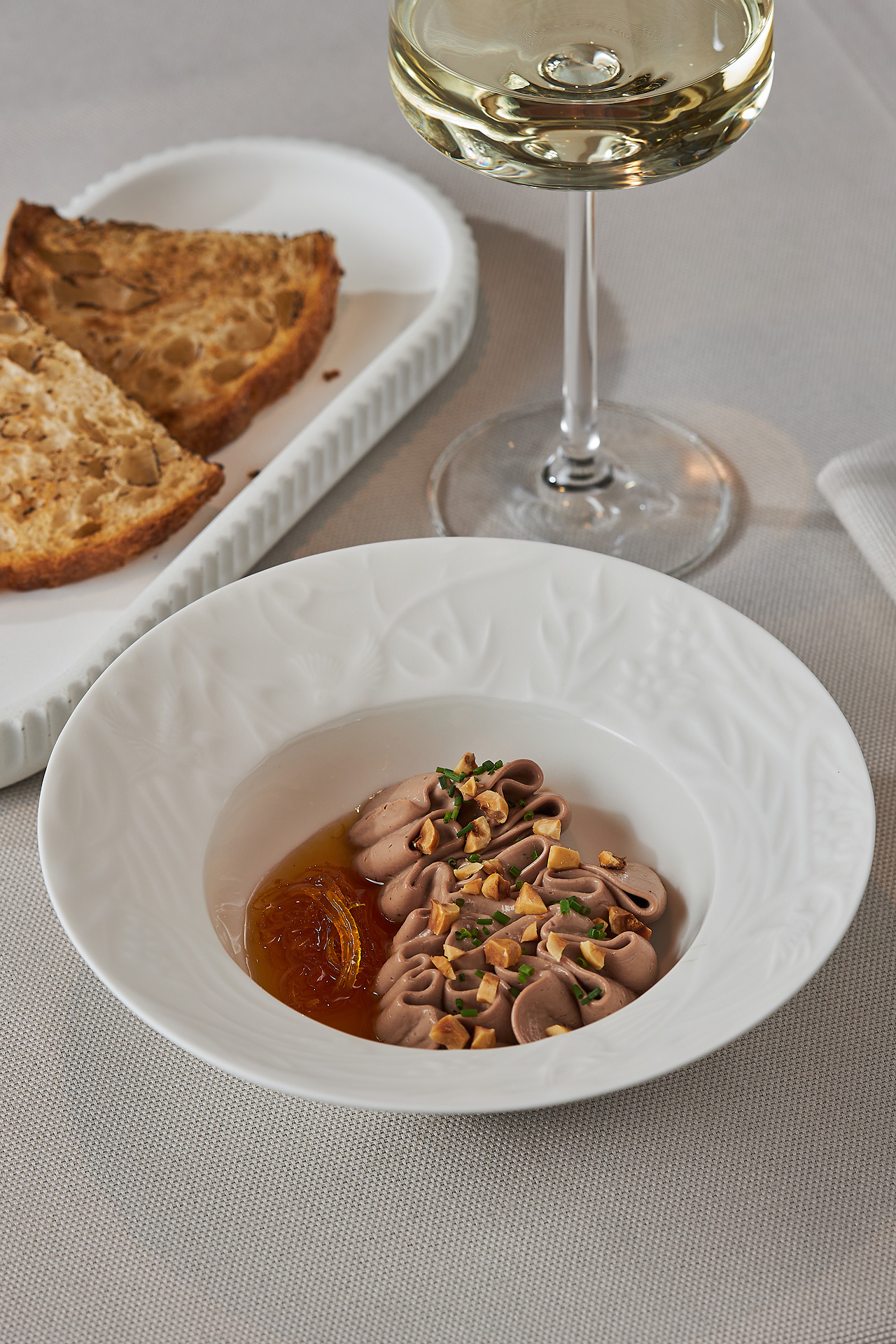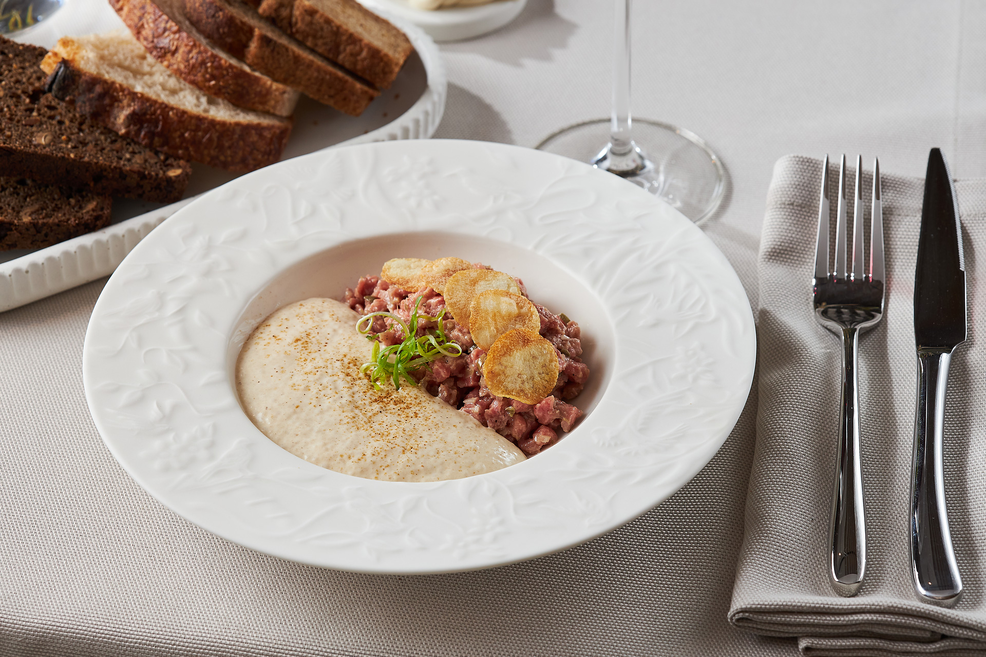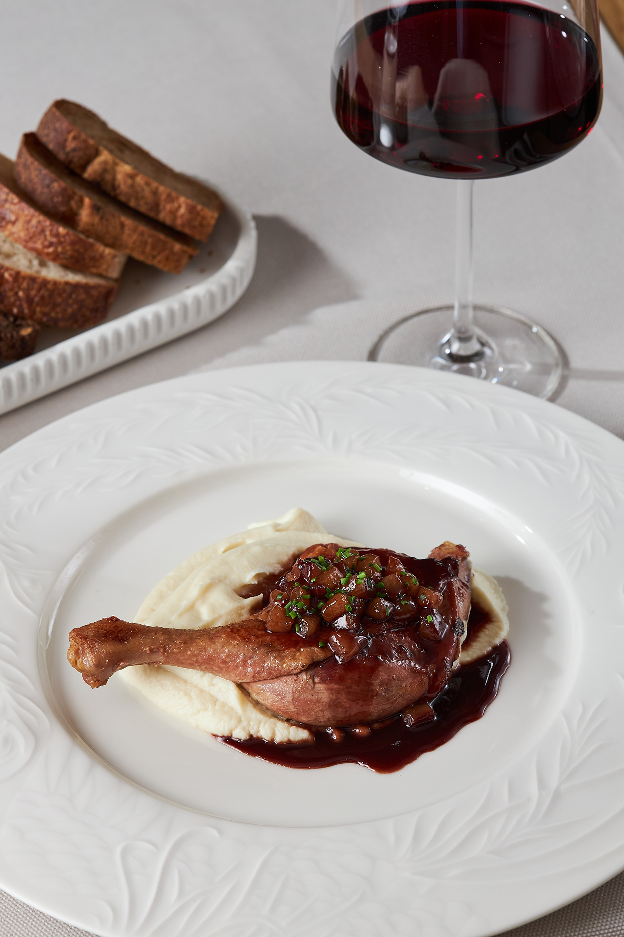 Утиная ножка конфи с кремом из сельдерея и чатни из груши