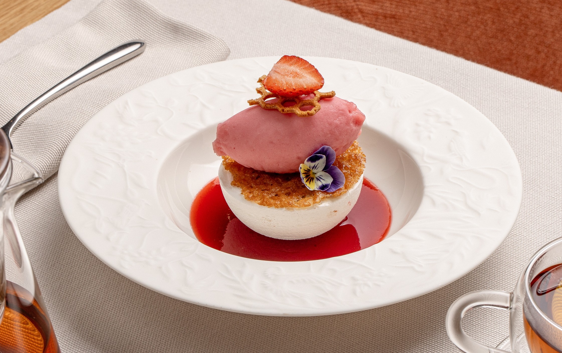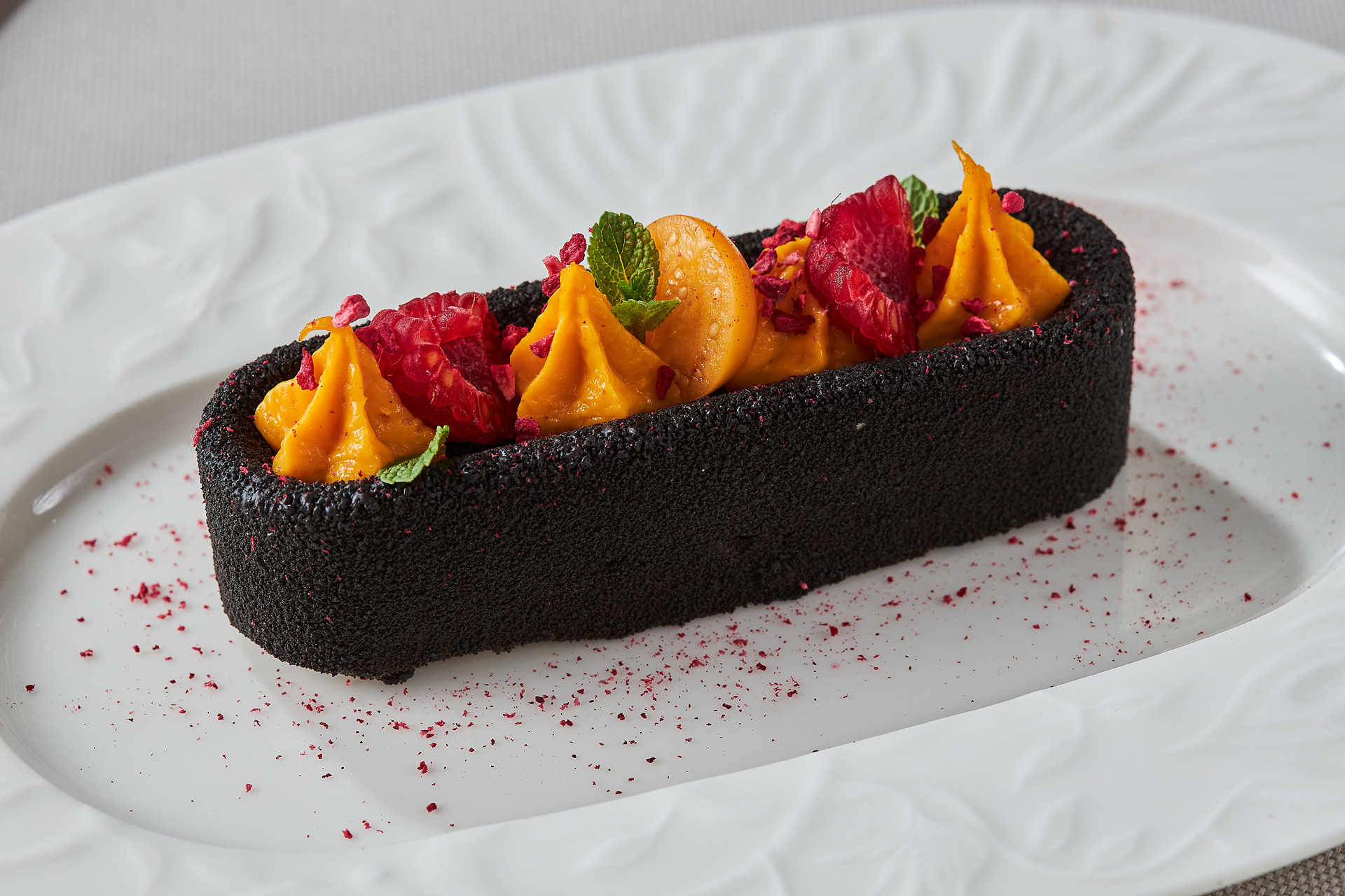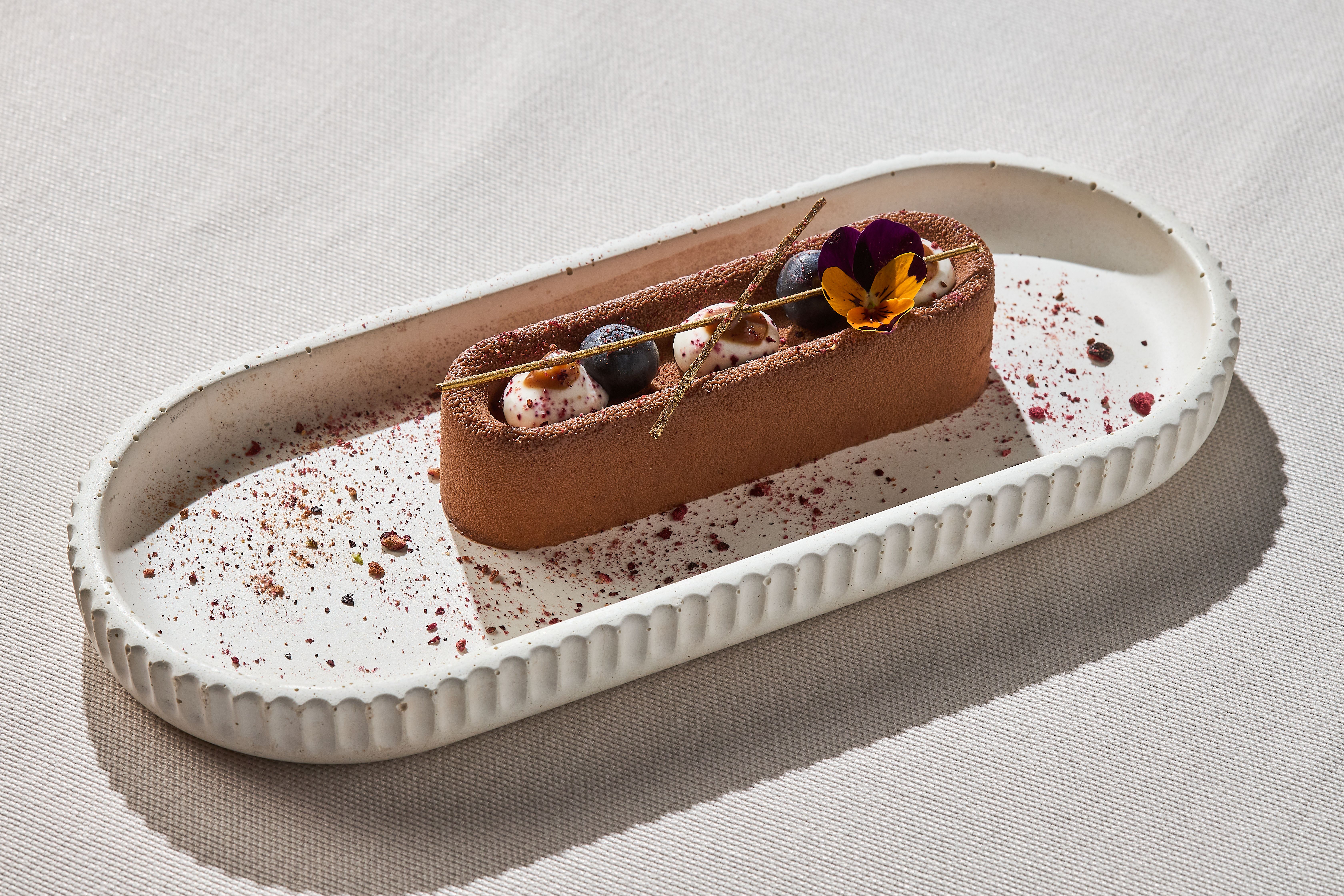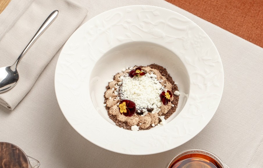 Солодовый брауни с кремом ганаш и снегом из белого шоколада