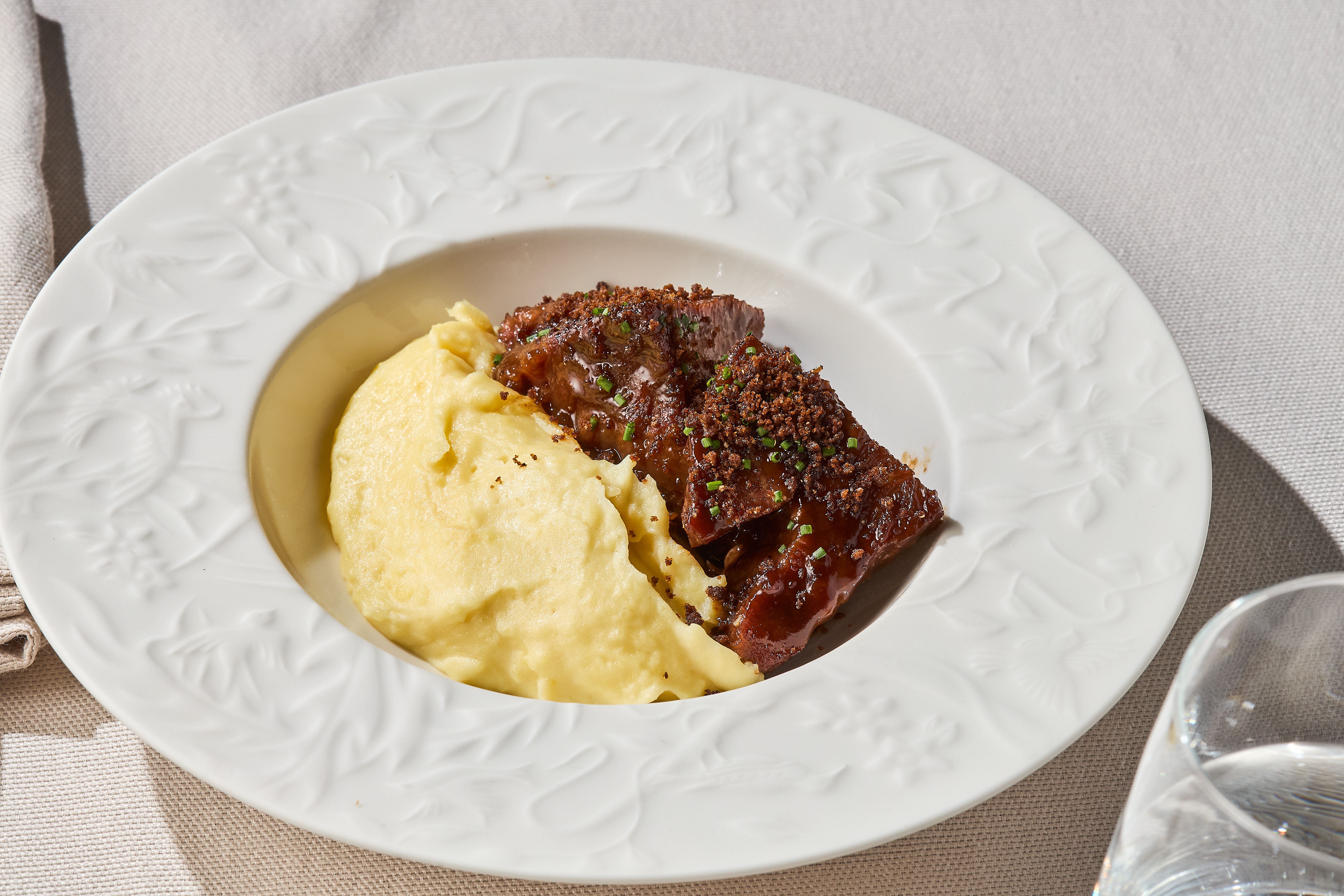 Телячьи щёчки в солодовом соусе с картофельным пюре