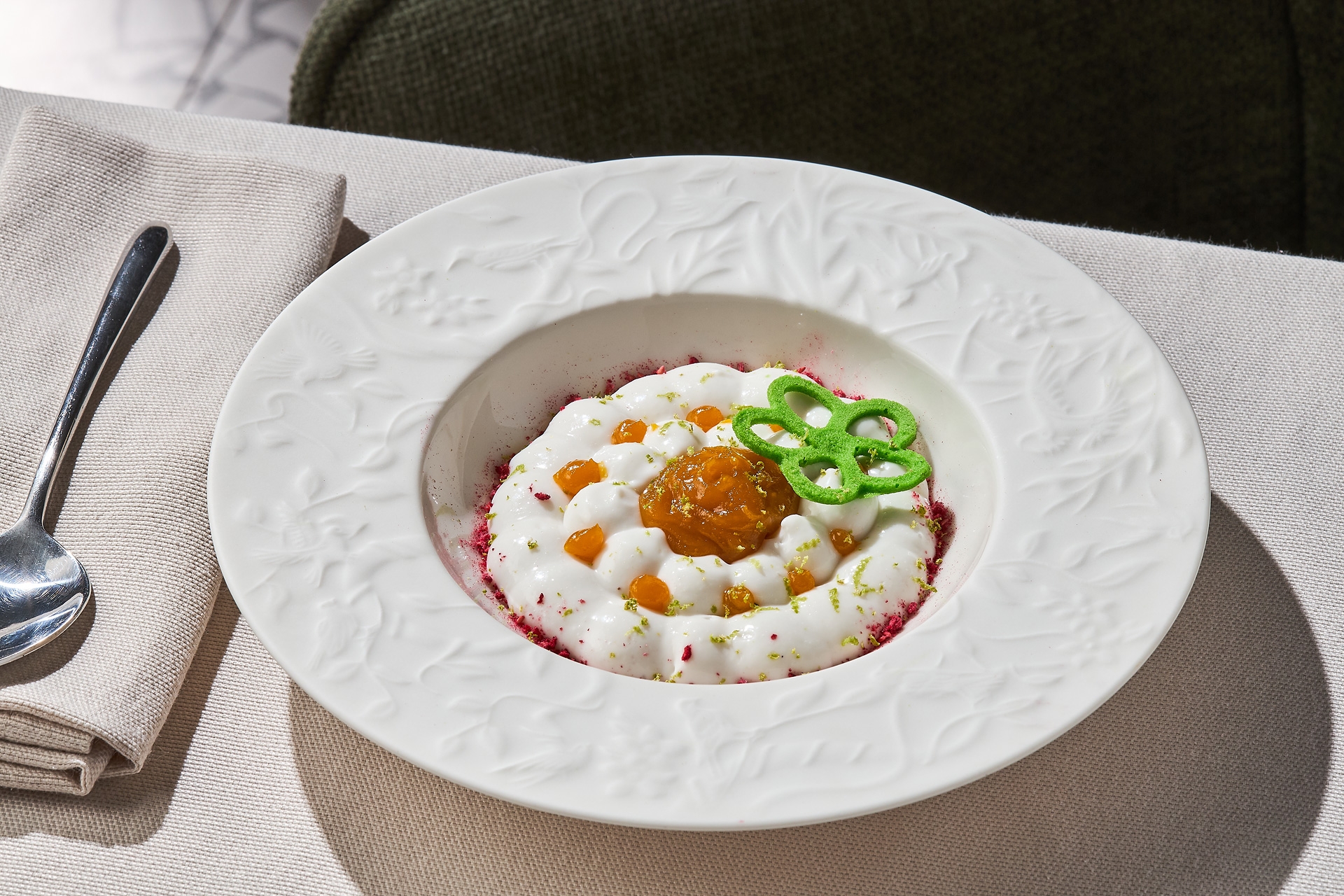 Кокосовый крем с попкорном из пшеницы и джемом манго